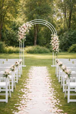 Trautor, besteht aus 1 Truss-Tor 3 x 3 m auf Standplatten, 3 x Traversenhussen weiß, Stoffe als Vorhang, 1 Kronleuchter (ohne Anschluss), ohne Blumen