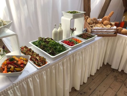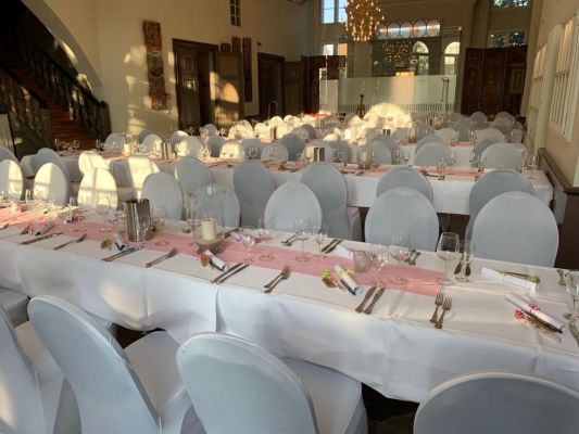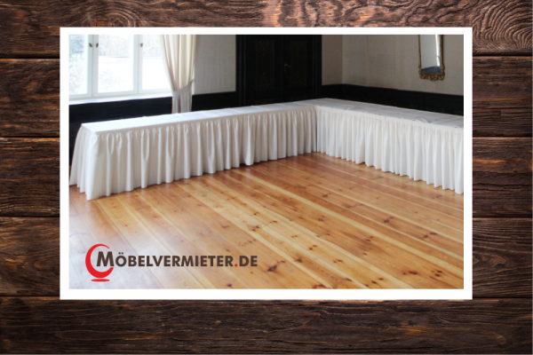 Tischwäsche mit Atlaskante, Vollzwirn, passend für Banketttisch 180 cm, inklusive Reinigung.